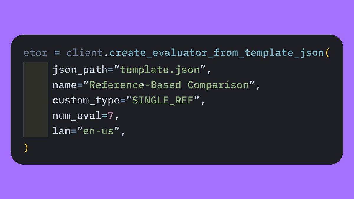 Creating comparative similarity evaluations via SDK is now simpler and more consistent.Previously, evaluations had to be partially created in the SDK and then manually completed in the workspace. Now, you can use atemplate.json directly in the SDK to create a complete evaluation end-to-end without manual workspace setup, making evaluation creation more reproducible and automation-friendly.