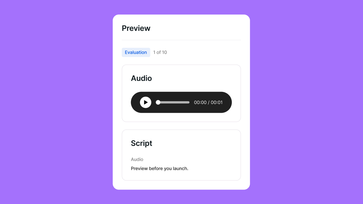 So far, you can use the provided evaluation templates. Now, you can add your own messages and followup questions up to 8. Instead of asking a single question, you can ask multiple questions on different types.Add audio examples