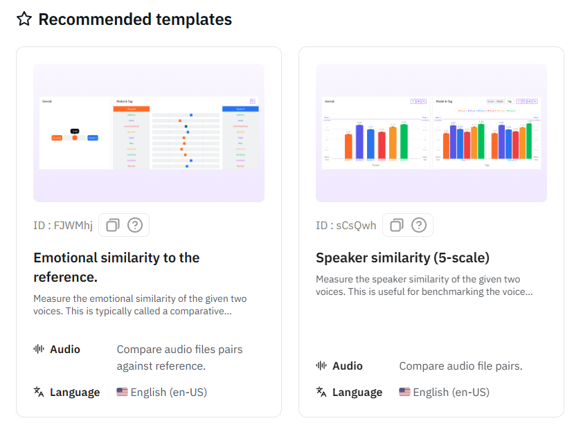 Streamline your evaluation workflow with Recommended Templates.Available via both SDK and Web, these pre-configured templates allow you to rapidly set up evaluations aligned with standard industry goals, reducing configuration time and ensuring best practices.